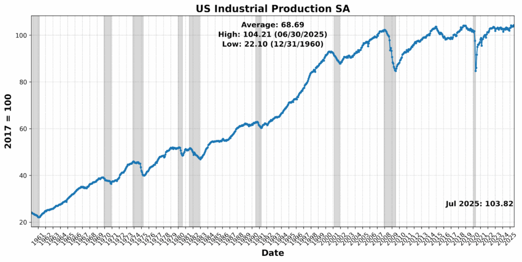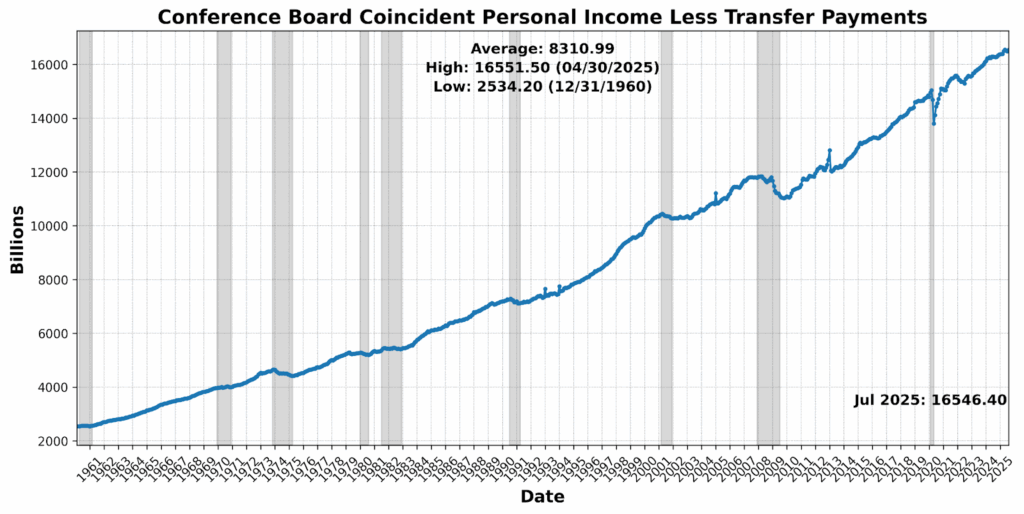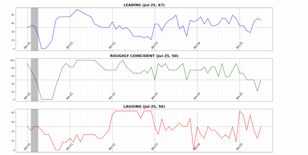 The Roughly Coincident Indicator rose from 21 to 50, marking a pause after June’s sharp contraction. Stability at this level reflects an offsetting mix of modest gains in sales, income, and payrolls against declines in production, participation, and sentiment — leaving the real-time picture flat but fragile.