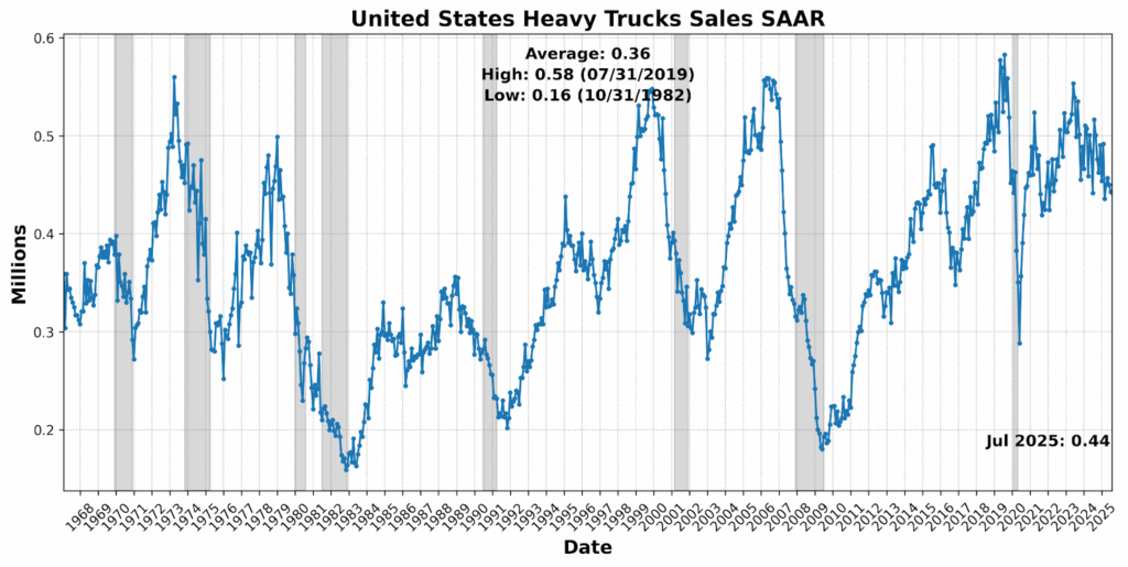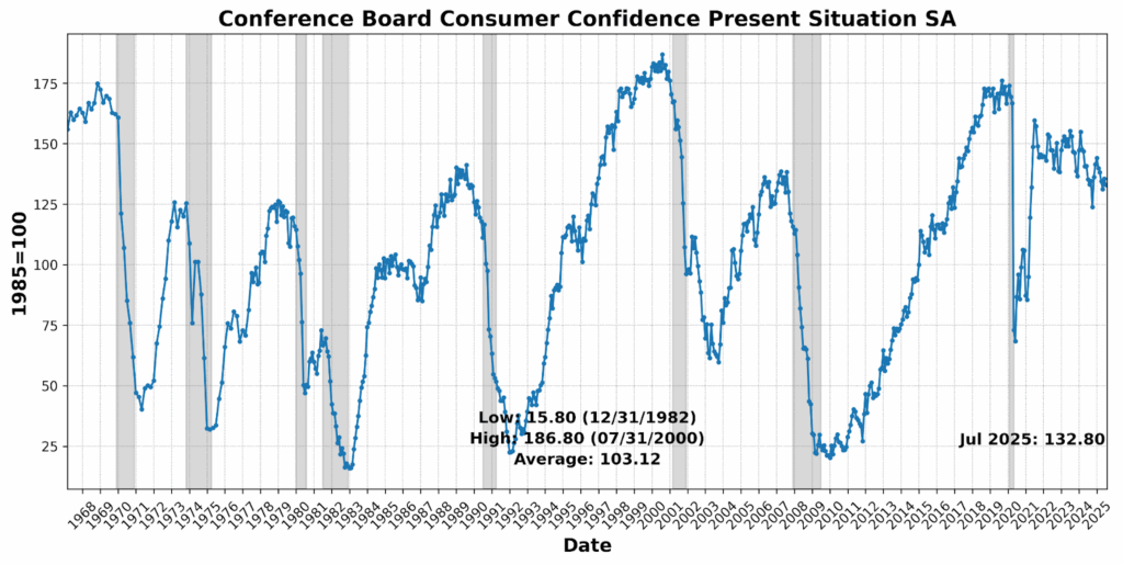 In July 2025, the three Business Conditions indicators are at a very different balance than they were one year prior. The Leading Index eased slightly but remains close to its strongest levels in well over twelve months. Markets and credit conditions continue to provide support, housing activity firmed, and jobless claims remained relatively low, suggesting some forward momentum. Still, the consumer mood is subdued and freight demand is soft, reflecting lingering caution after the “Liberation Day” tariff shock in April. The result is a forward picture that looks sturdier than it felt in the spring, but with confidence still tenuous.