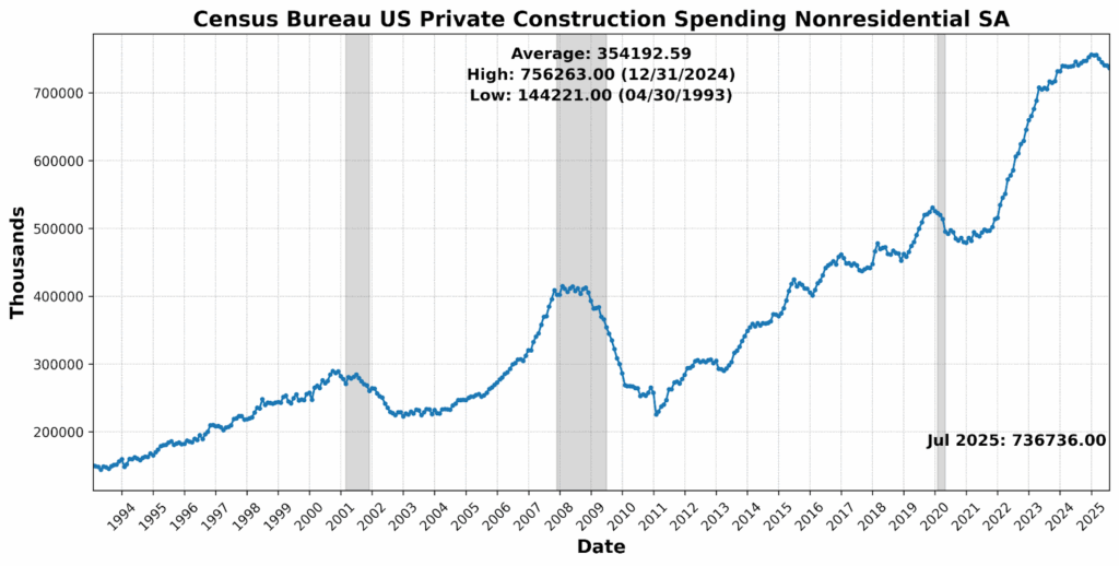 Survey data reinforce this fragile balance. The ISM manufacturing PMI ticked up to 48.7 in August, still in contraction but supported by stronger new orders and a slower pace of job losses. Supplier deliveries slowed, suggesting tighter supply chains, and price pressures eased modestly, but production slipped and backlogs shrank, leaving output highly sensitive to monthly demand. Services fared better, with the PMI rising to 52.0 as new orders accelerated to their strongest pace in nearly a year, supported by demand from data centers and tariff front-running. Yet, respondents reported mounting input-cost pressures and difficulty shielding customers from higher prices, while employment remained in contraction and backlogs shrank further. In short, manufacturing remains mired in weakness while services provide a modest cushion, though both are under stress from tariffs, labor strains, and rising costs.
