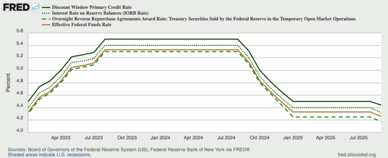 Through August 2025, the Fed’s target FFR range was 4.25–4.5 percent. To achieve its target, the Fed set IORB at 4.4 percent, ON RRP at 4.25 percent, and the discount rate at 4.5 percent. As a result, the effective FFR has landed roughly in the middle of IORB and the ON RRP at 4.33 percent throughout 2025 (Figure 1).