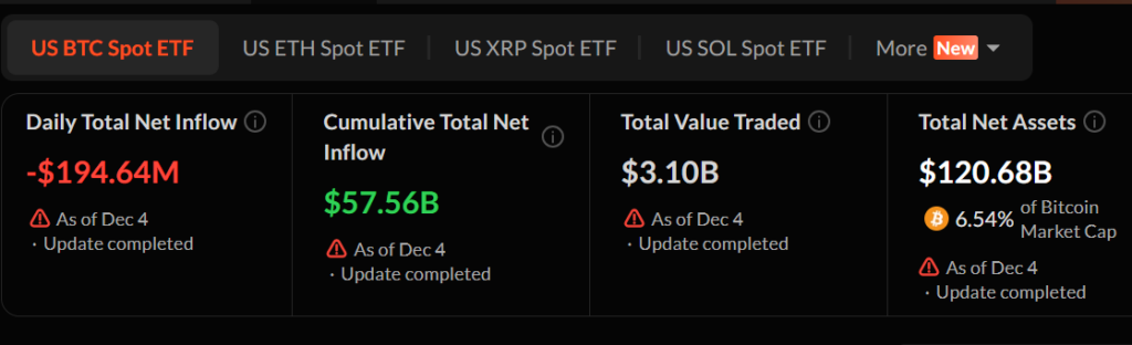 Nevertheless, the December 4 data confirms a notable reversal as spot Bitcoin ETFs collectively logged $194.64 million in net outflows.