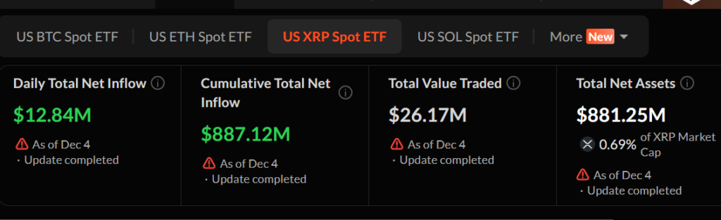 XRP spot ETFs have drawn over $887 million in total net inflows since the November 14 debut.