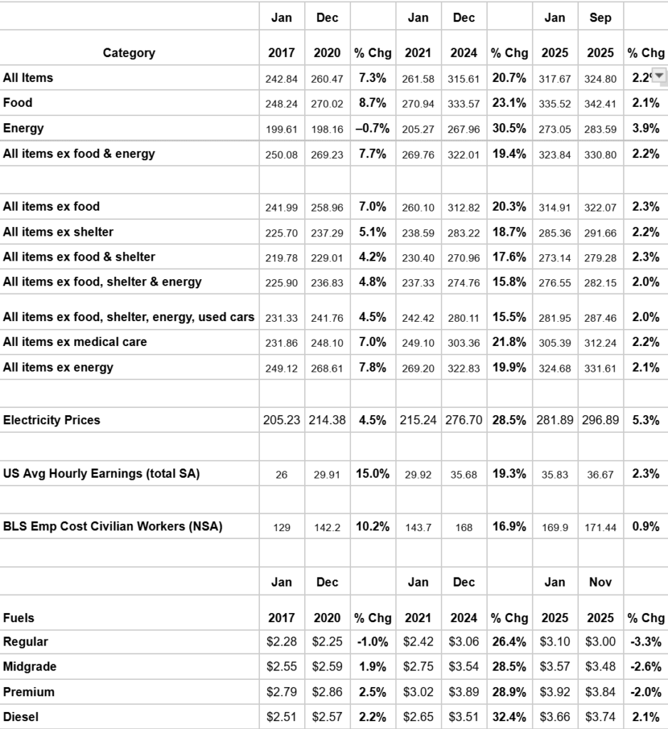 The same pattern holds in individual food categories. Sirloin steak, coffee, beef cuts, and many packaged goods are all measurably higher now than in January 2025. A few categories have fallen from recent peaks, but not enough to reverse the cumulative increases since 2021. In fact, several items rose more in the first nine months of 2025 than during the entire 2021 to 2024 period. This suggests not only that elevated prices remain embedded in household budgets, but that some categories continue to accelerate even after “high inflation” has supposedly ended. Put plainly, the affordability crisis that began in 2021 has not faded; it has evolved into a stubborn, category-specific price pressure affecting everyday goods.