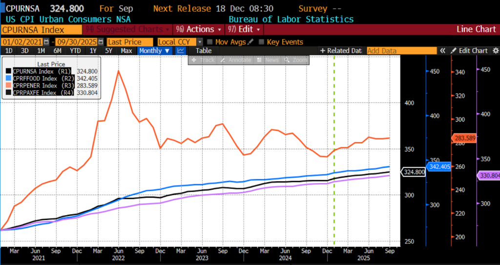 CPI Food, Energy, Core, and Electricity, November 2024 – September 2025