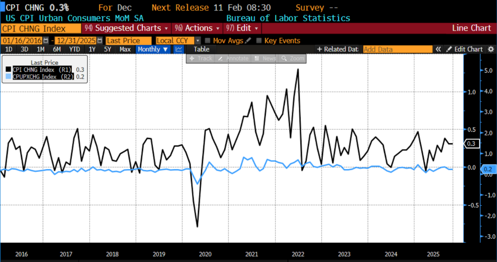 On the year-over-year side, December 2025 headline data rose to 2.7 percent, which matched forecasts. The core index, which excludes food and energy, rose 2.6 percent — slightly less than the expected 2.7 percent.
