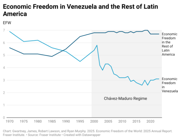 In 1970, Venezuela scored a little less than 7 on the Fraser Institute’s 10-point Economic Freedom of the World index, making it the 13th most economically free country in the world, just ahead of Japan.