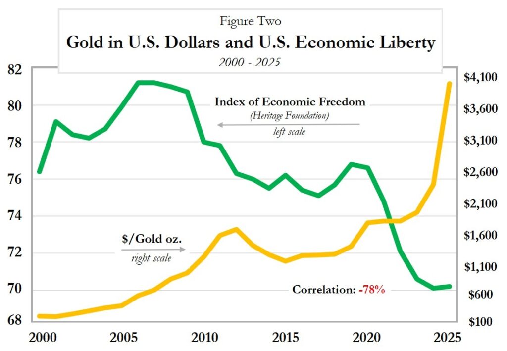 Substantive change has occurred in the subjects examined in my second book, Gold and Liberty (AIER, 1995), since it was published three decades ago. That change has been mostly negative, unfortunately, especially during the first quarter of this century. As economic liberty has decreased, gold has increased, a historical pattern which is by no means random.