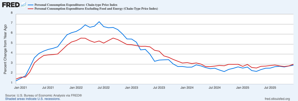 Figure 1. Headline and Core Personal Consumption Expenditures Price Index Inflation, December 2020 – December 2025