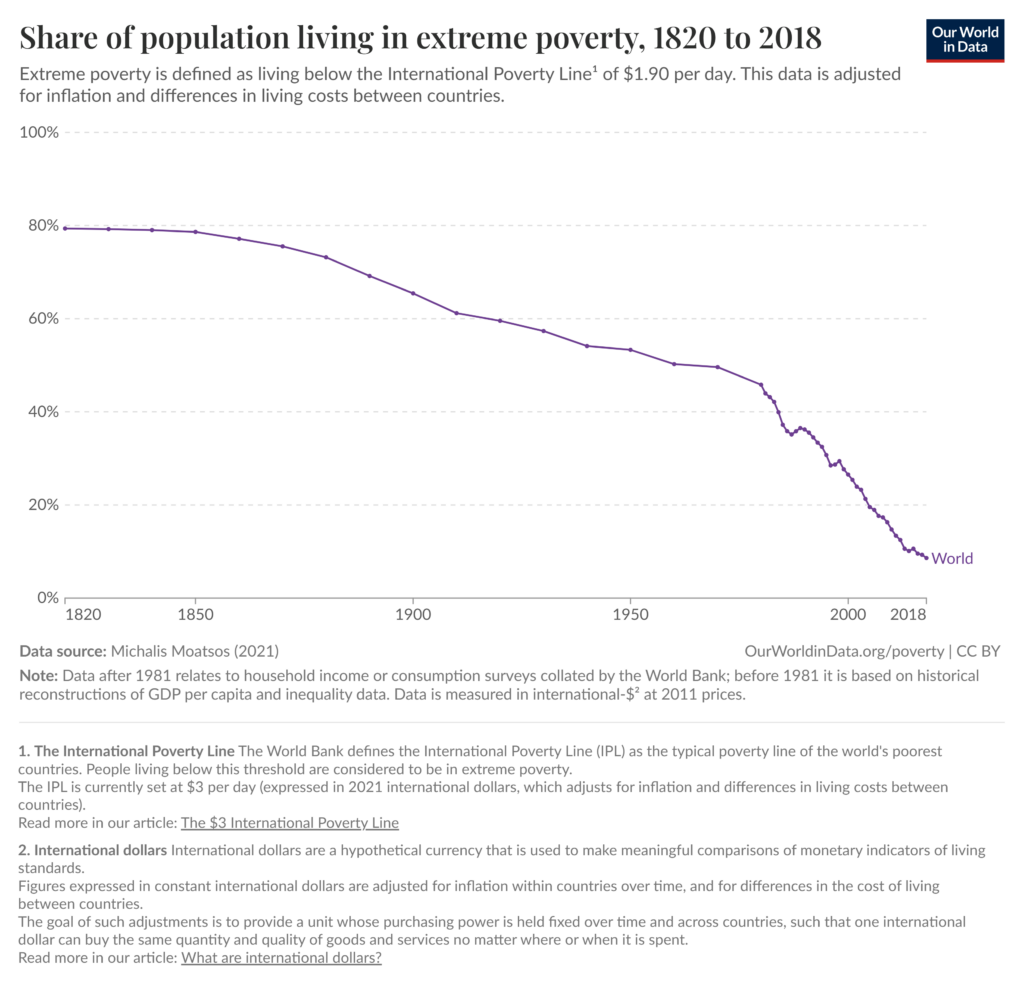 The evidence is overwhelming. In 1820, more than 90 percent of the world lived in extreme poverty. Today, that figure is under 10 percent, as shown by data on extreme poverty over time. Life expectancy has doubled. Child mortality has collapsed. Access to goods and services, once considered luxuries, has become common.