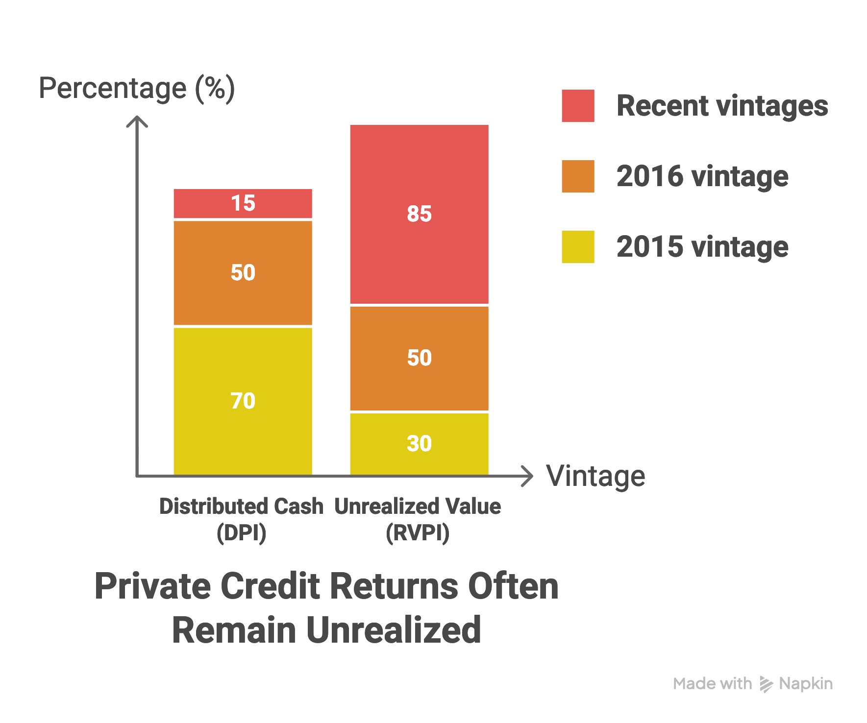 For the 2016 vintage, the share of unrealised value rises to around 50%, and for more recent vintages, RVPI accounts for over 80–90% of performance.