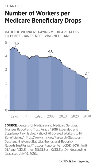 Medicare, enacted in 1965, was designed for a different era — one with higher birth rates and a robust worker-to-retiree ratio. The worker-to-beneficiary ratio has already fallen from roughly 42:1 in the program’s early decades to 2.8:1 today and is projected to reach 2.2:1 by 2099.
