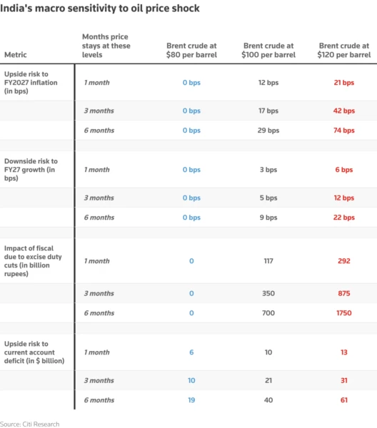 Citi estimates that a three-month supply disruption could shave 20 to 30 basis points from India’s growth in fiscal year 2027.
