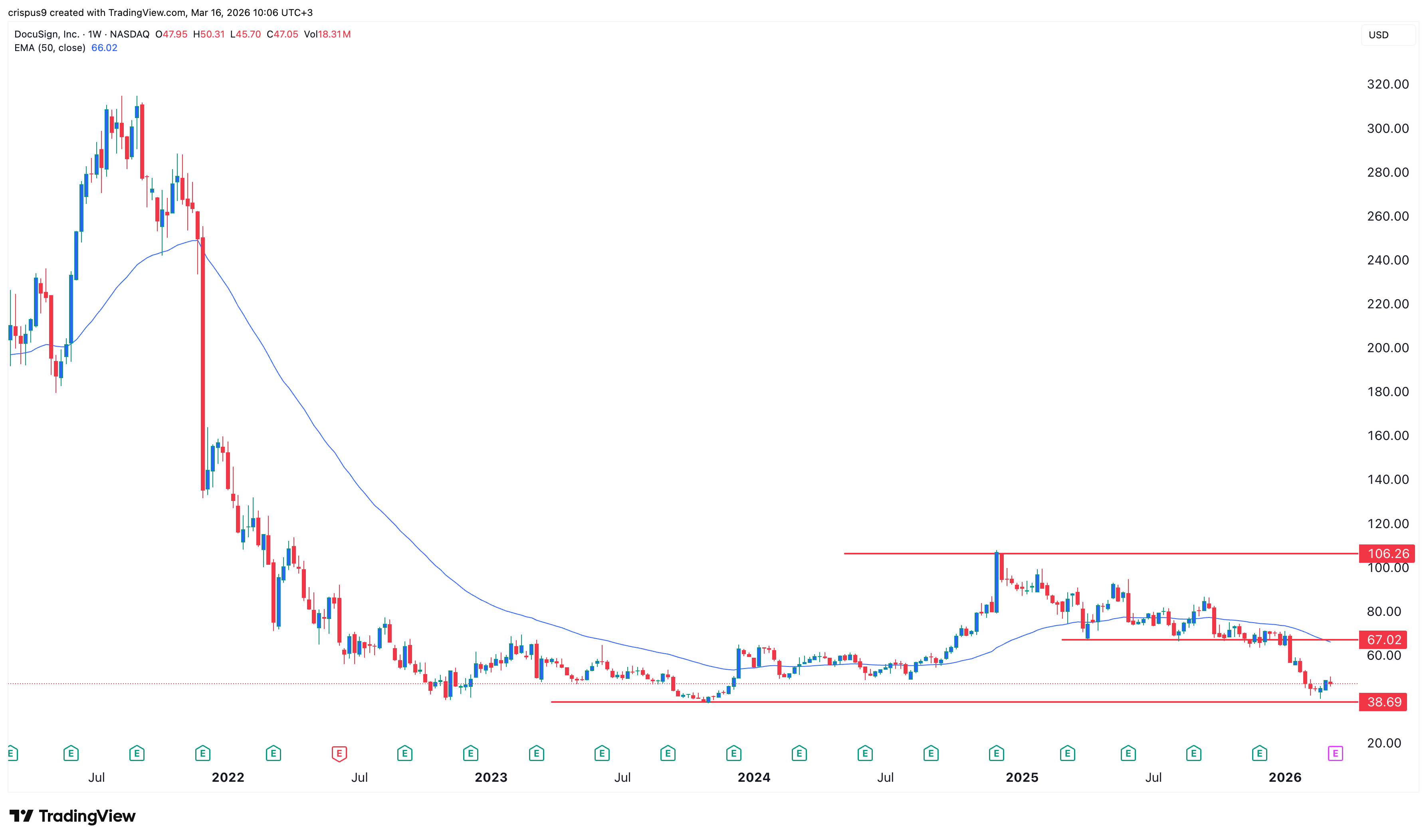 The weekly chart shows that the DOCU stock price has come under pressure in the past two years, falling from a high of $108 in December 2024 to the current $47.