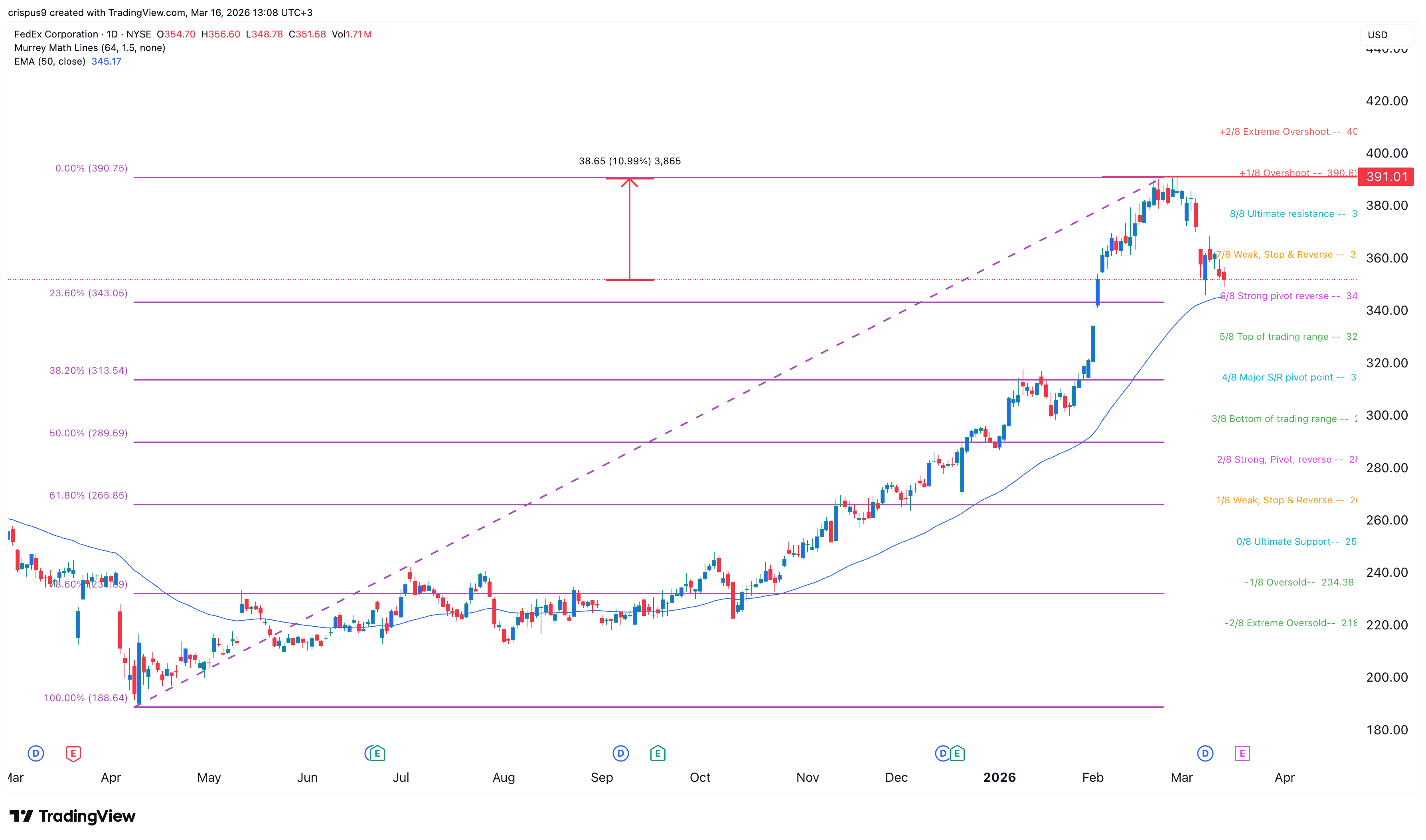 The daily chart shows that the FDX stock price has dropped from the year-to-date high of $391 in February to the current $350.