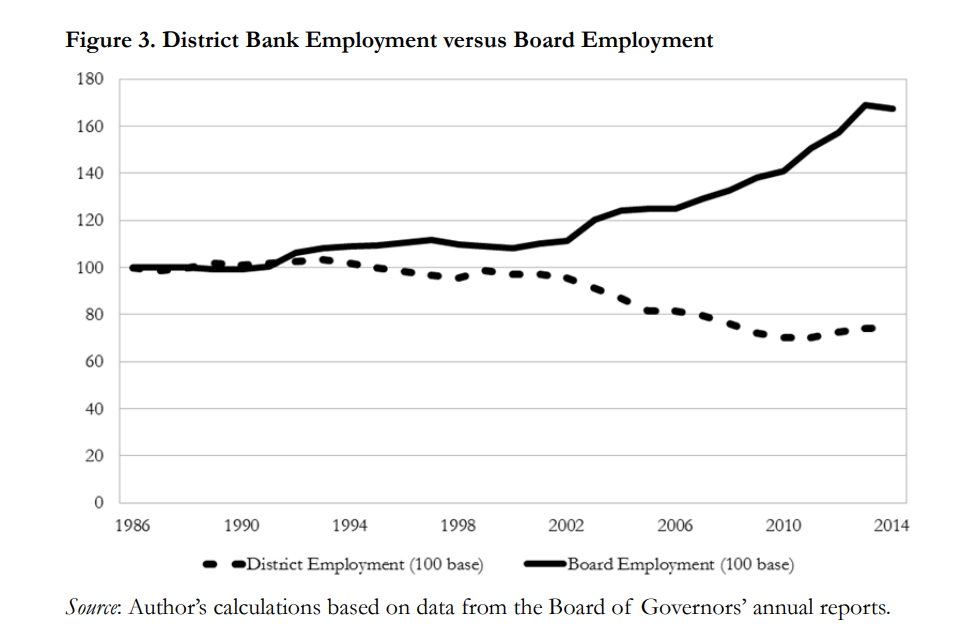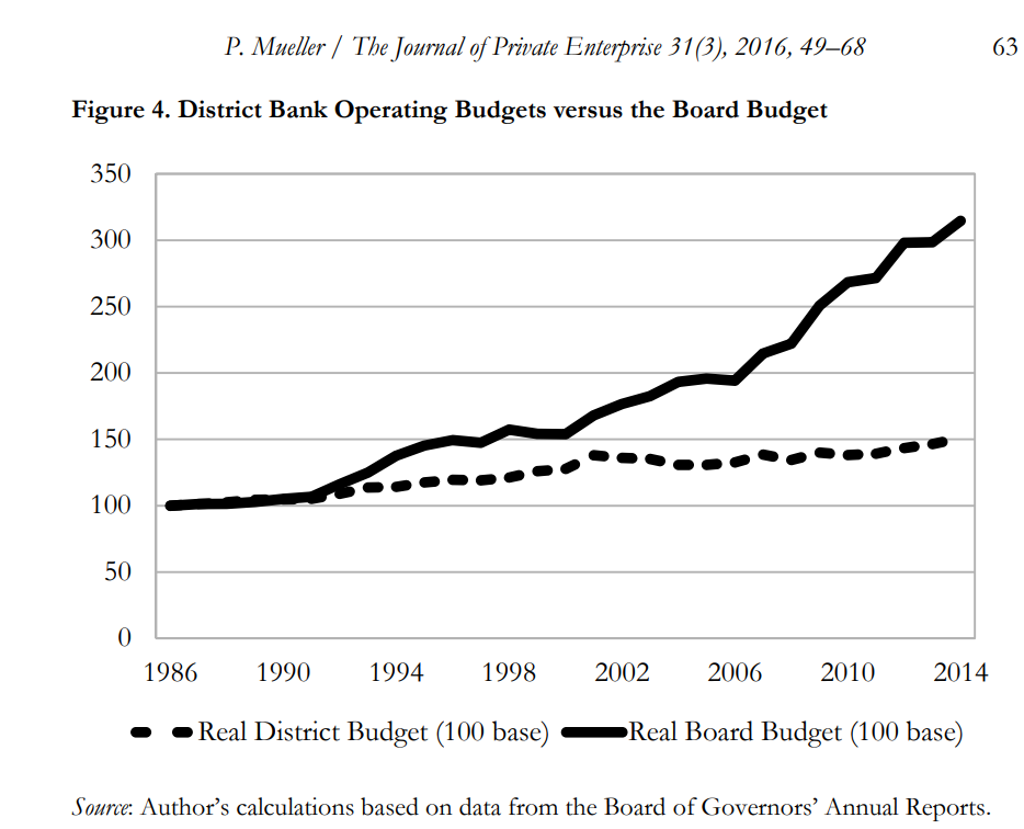 The budget of the Board of Governors of the Fed has grown more consistently than the Federal budget for decades. In fact, why would any office or department at the Fed ever voluntarily reduce its spending? As such, we don’t see examples of significant retrenchment or budget cuts across the Board of Governors. District banks, on the other hand, operate with private-sector participation through their member-bank stockholders, yet they still suffer from bureaucratic bloat due to limited market competition.