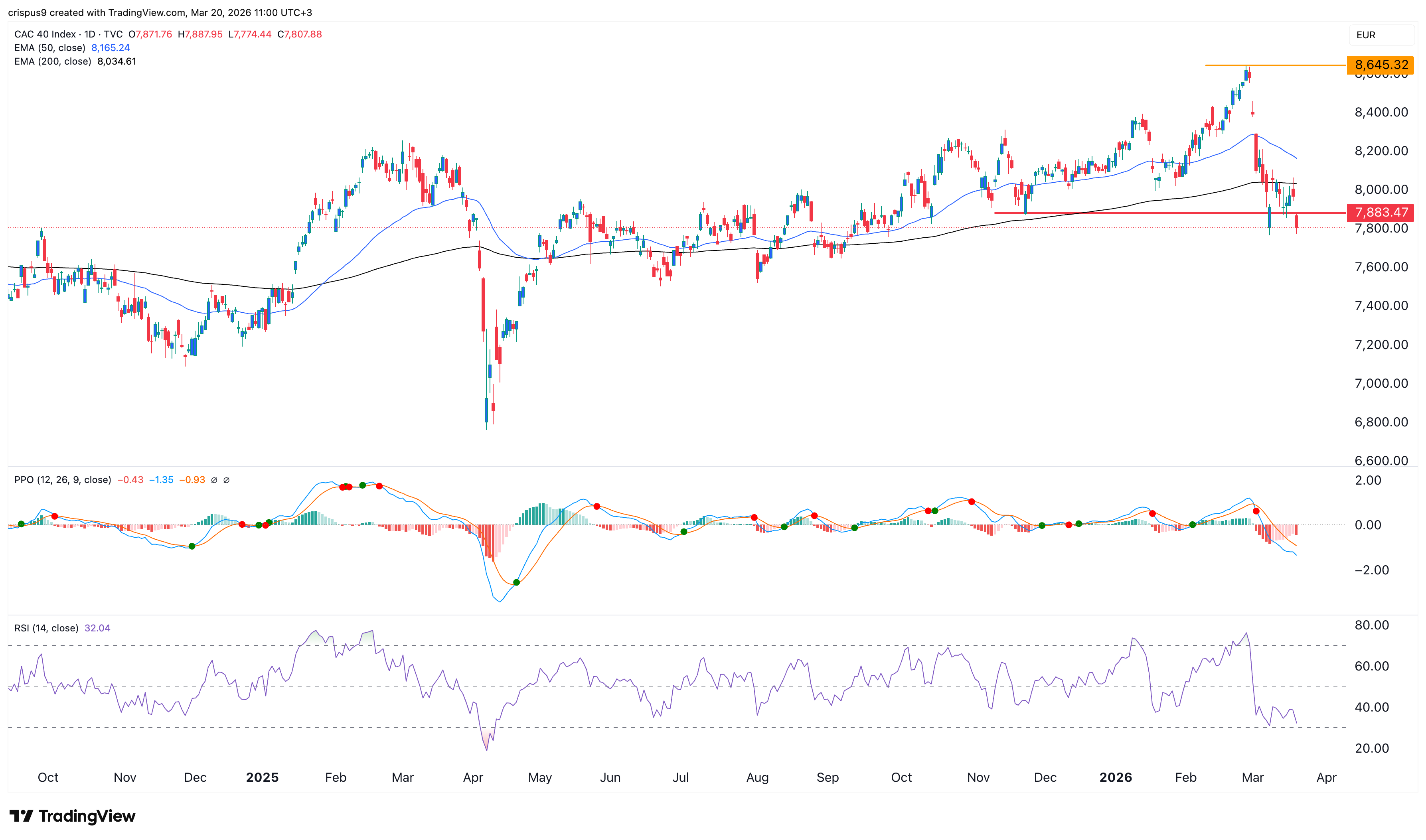 The CAC 40 Index has come under pressure this month, mirroring the performance of other European stocks, which have plunged during the ongoing Iran war.