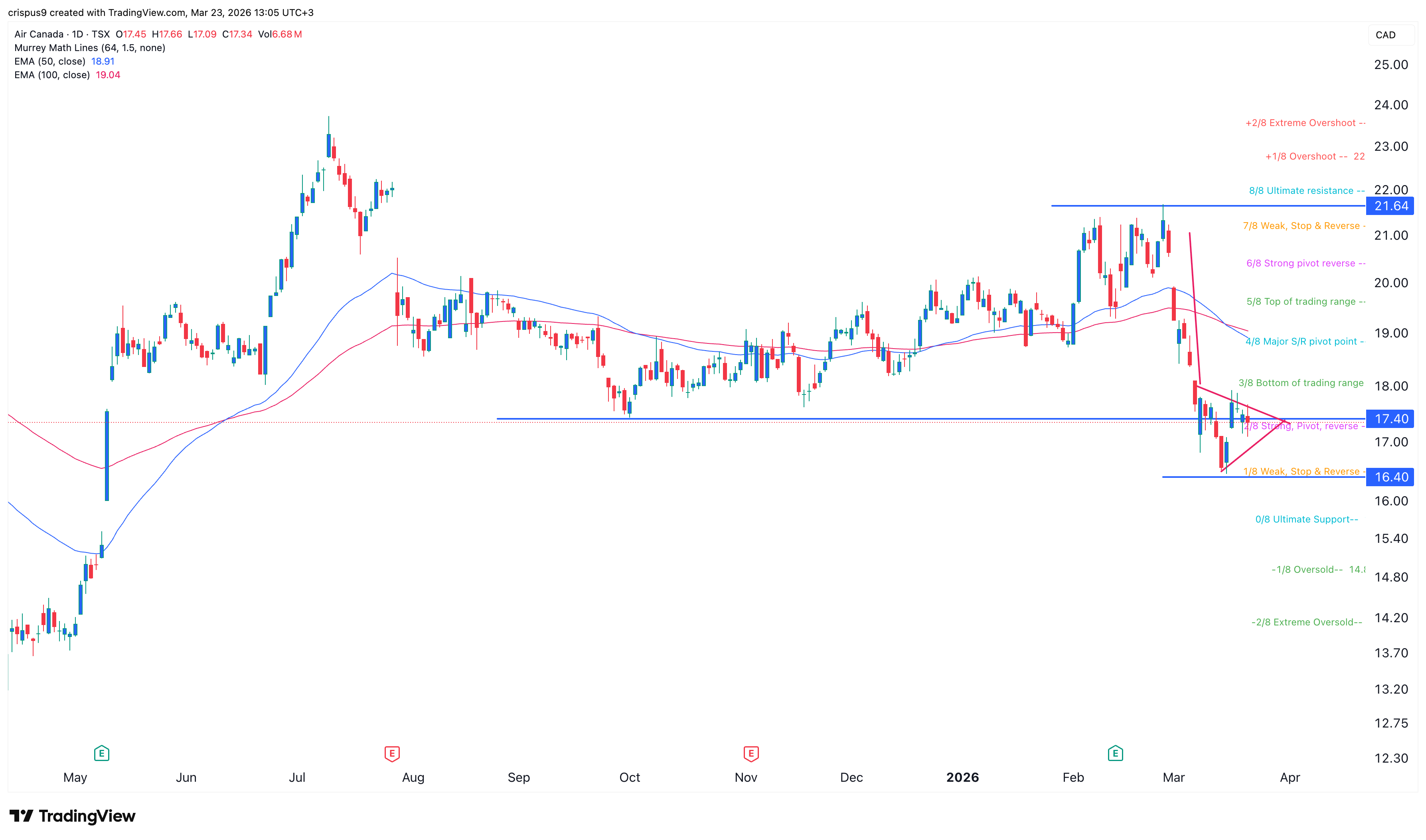 The daily chart shows that the Air Canada stock price has crashed in the past few weeks, moving from a high of $21.6 in February to the current $17.4.