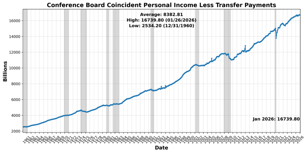 On the positive side, Conference Board Coincident Manufacturing and Trade Sales increased 0.8 percent, and US Industrial Production rose 0.3 percent. However, Conference Board Coincident Personal Income Less Transfer Payments declined 0.2 percent, and Conference Board Consumer Confidence Present Situation SA fell 2.1 percent. US Labor Force Participation Rate edged down 0.2 percent, while US Employees on Nonfarm Payrolls Total SA was essentially flat. The balance of evidence suggests modest activity in production and sales, but weakening income growth, participation, and sentiment are weighing on current conditions.