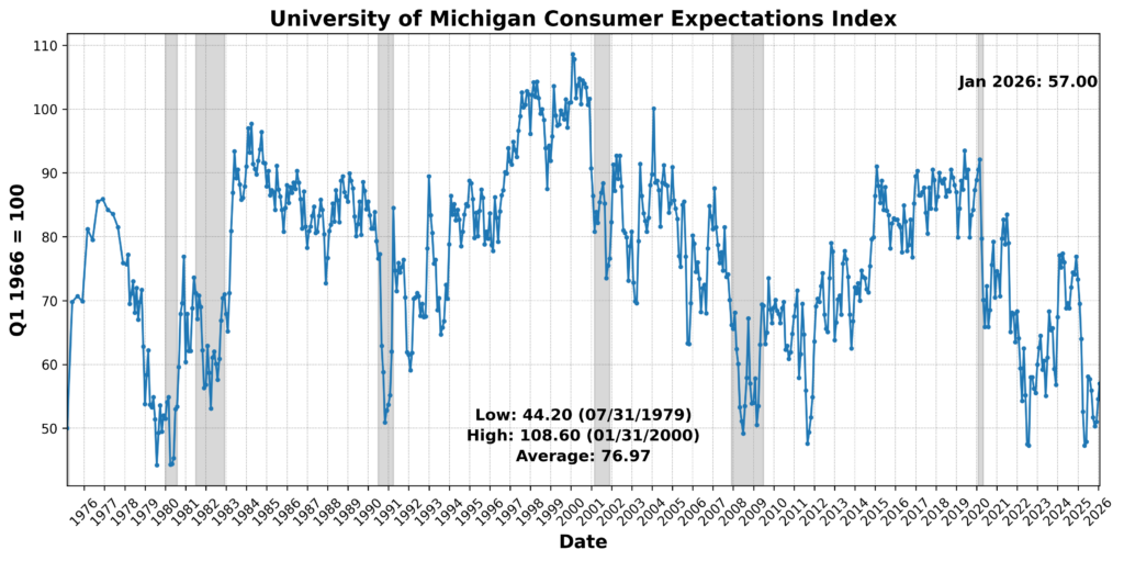 The January 2026 BCM readings suggest an economy with a modestly positive forward tilt, uneven current activity, and still-soft trailing conditions, but with an important caveat given the break in the data. The Leading Indicator (63) points to resilience in expectations, housing, and market-sensitive components, indicating some forward momentum despite lingering weaknesses in production metrics and an adverse yield curve signal. In contrast, the Roughly Coincident Indicator (42) reflects a mixed present, where gains in production and sales are offset by declining income growth, sliding labor force participation, and soft consumer sentiment, leaving real-time activity subdued. The Lagging Indicator (33) reinforces a softer backdrop, with tightening credit conditions, weakening construction, and longer unemployment durations outweighing persistent inflation pressures. Taken as a whole, the configuration is consistent with tentative forward strength layered over fragile current conditions and weakening underlying fundamentals. But because these figures follow a several-month gap in complete data, they should be interpreted cautiously as a snapshot of current conditions rather than as evidence of a sustained trend or turning point.