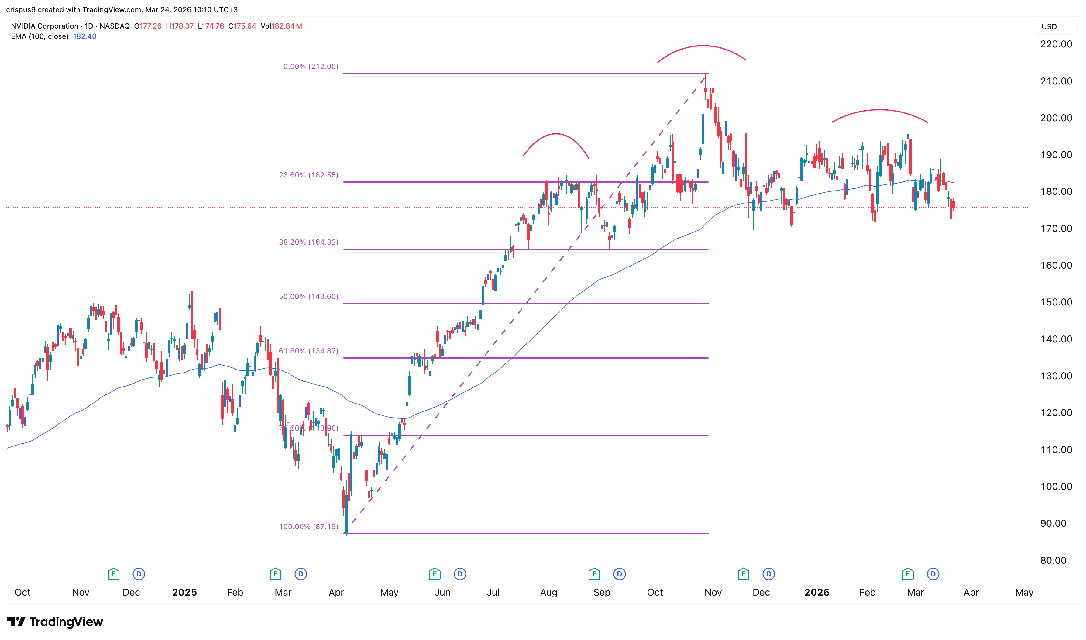 The daily timeframe chart shows that the NVDA stock price has dropped from the all-time high of $212 to the current $175.